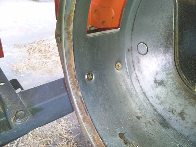 クボタ・コンバインSR30の2番処理ケースの摩耗で、ケース上部に穴が開きライナの止めネジ(サラコネジ)が無くなっています。