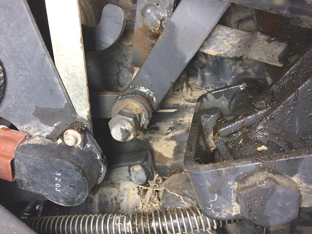 ジャッキ・アップして右後輪を外して確認してみると、やはりデプス・レバーが曲がって連結ロッドに干渉しています。