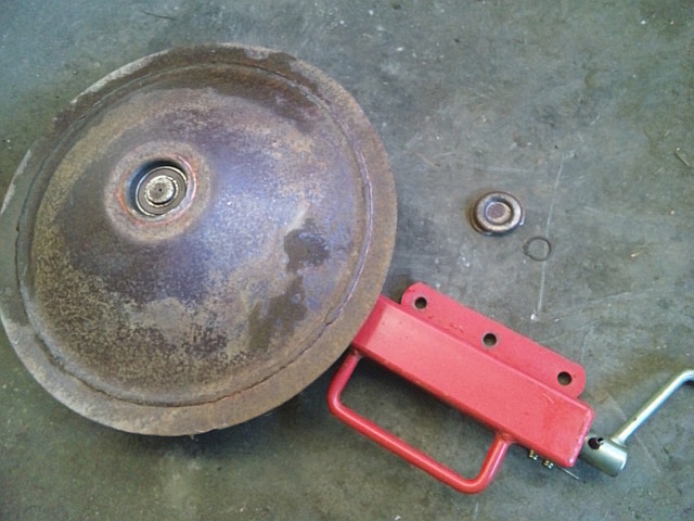 前項の尾輪は酸素アセチレン溶接を使いましたが、この尾輪はフォーク・リフトの爪の上に置き、ハンマで叩いて軸を取り外しました。