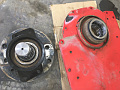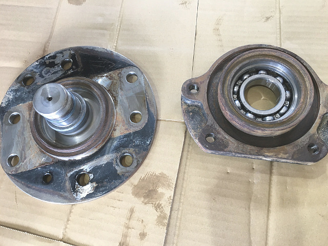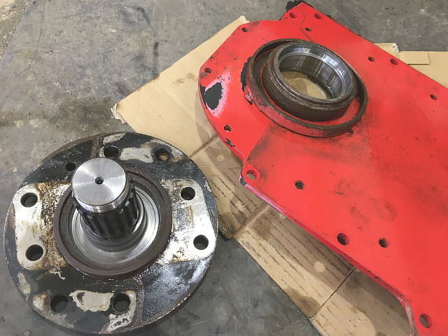 左写真はチェーン・ケースからスプライン軸を取り外し、フローティング・シール、スフェリカル・ローラ・ベアリング、スナップ・リング、ガードを取り外した状態です。