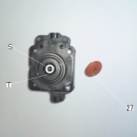 27のチェック・バルブの根元の部分(中心部)がSの穴に取り付き、 27のチェック・バルブの外周面がTの穴を塞いでいます。