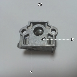 Bの穴はAの穴に繋がっているパルス穴で、クランクケース内でピストンが上下する時に発生する脈動圧を、 インシュレータを経由して3のダイヤフラム・ポンプに伝える穴です。
